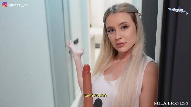 Парень хочет удивить красивую соседку и приносит ей дилдо в пакете, которое она брезгливо рассматривает. Через время, блондинку начинает все больше волновать резиновый фаллос и она проводит в комнату парня, чтобы баловать его минетом. Чувак даже не рассчитывал на такой удачный случай и мигом поставил раком сучку, чтобы трахнуть в киску. Она отодвигала трусики в сторону, чтобы не терять времени на раздевание.