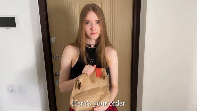 Милая рыжая курьерша слишком долго доставляла заказ с едой, за что ей пришлось извиняться перед ним, но словами тут ситуацию не исправишь - теперь ей придется сосать и трахаться в киску! Рыженькая шлюшка стала делать минет недовольному клиенту, чем задобрила его, но пока недостаточно, сейчас ей надо смачно почпокаться с ним в мокрую киску. Девка очень даже рада тому, что опоздала, ведь если бы так не случилось, то она б и не получила такой спонтанный секс!
