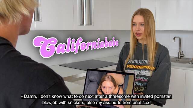 Красивая сводная сестра Калифорния Бейби снова дала своему сводному брату на камеру - она нарядилась в красивые черные чулки с бельем и дала потрогать свою попку, а потом еще и пенис отсосала. Получив минет от белокурой красотки, кавалер сразу же начал иметь ее в вагину раком и в других позициях, а после этого еще и поигрался анальной пробкой в ее заднице и возбудил тем самым еще сильнее. В итоге она подрочила ему и довела до окончания на пол.